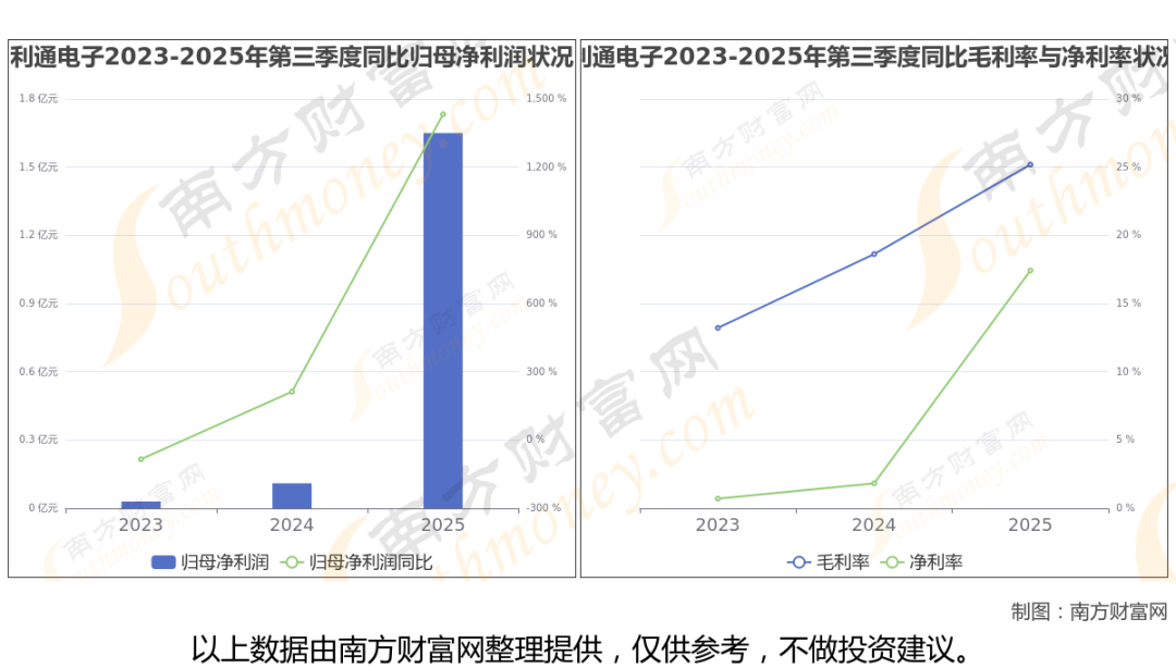 2025年第三季度季报显示,利通电子公司毛利率25.19%,净利率17.43%,归属净利润1.65亿,同比增长1432.9%。