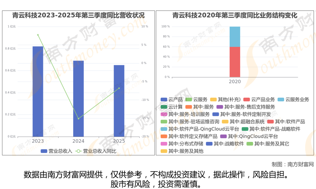 于2025年第三季度,青云科技披露了其业绩表现(如上图),其中主营业务收入6475.93万元,相较于去年同期-6.79%。