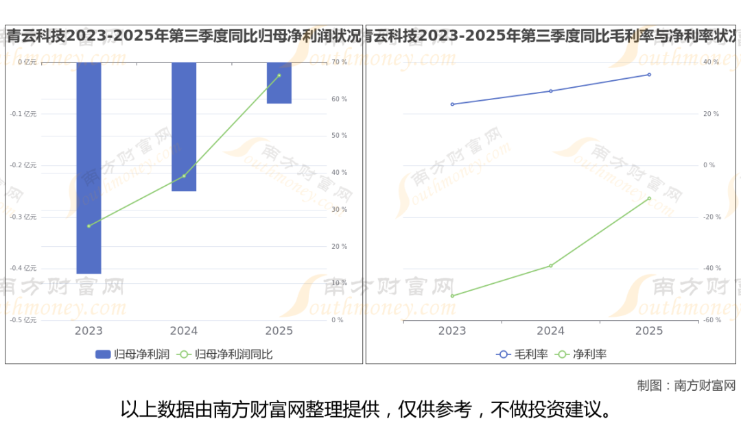2025年第三季度季报显示,青云科技公司实现净利润-842.55万,同比增长66.46%;毛利润为2282.56万,毛利率35.25%。