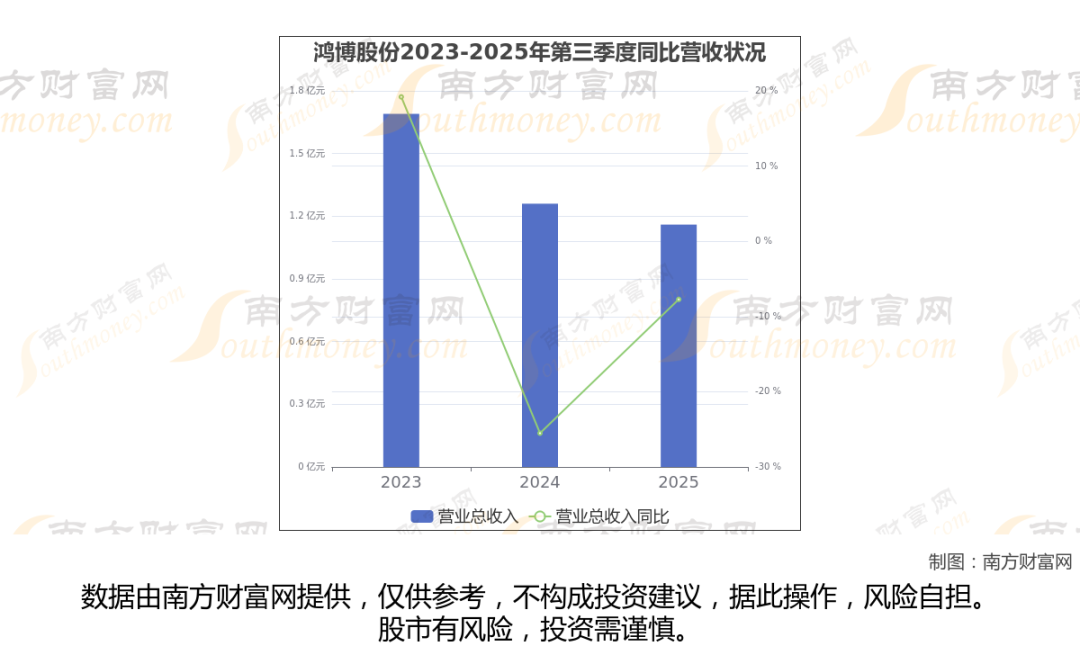 于2025年第三季度,鸿博股份披露了其业绩表现(如上图),其中主营业务收入1.16亿元,相较于去年同期-7.72%。