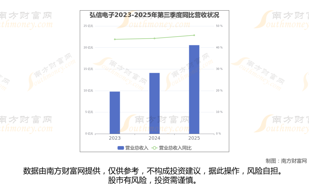 弘信电子披露了2025年第三季度财报。报告显示(如上图),弘信电子2025年第三季度实现营收20.56亿元,同比45.72%。