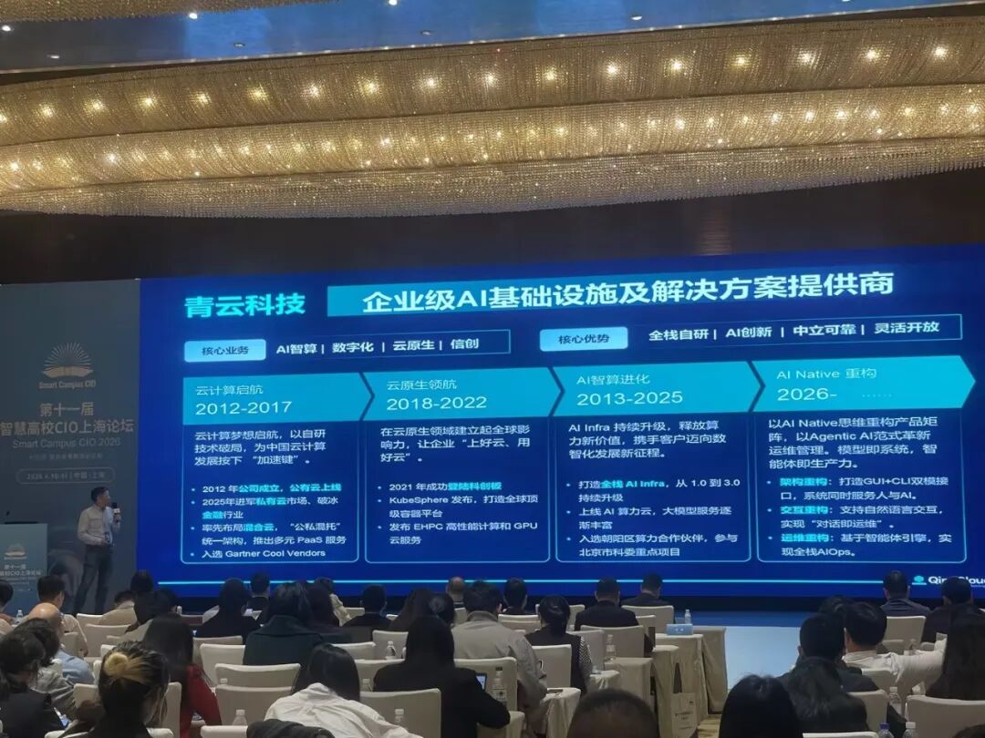 以“AI 引领,智启高等教育新征程”为主题的第十一届智慧高校 CIO 上海论坛圆满落幕。本次论坛汇聚了全国各地高校信息化建设决策者、行业专家及领先企业代表,聚焦AI大模型、算力支撑、校园信息化运营等前沿议题,共探信息技术与高等教育深度融合的路径与未来。青云科技作为企业级 AI 基础设施及解决方案提供商,受邀出席本次盛会。