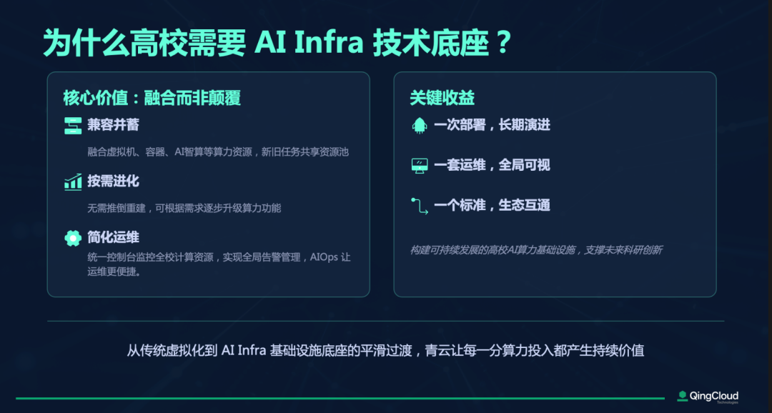 青云科技将持续深耕智慧高校领域,立足高校教学科研与管理的核心需求,迭代优化 AI Infra 3.0 架构及相关解决方案,与客户及合作伙伴携手共建高校 AI Infra 基座,降低高校数智化转型成本,助力高等教育数智化新征程行稳致远。