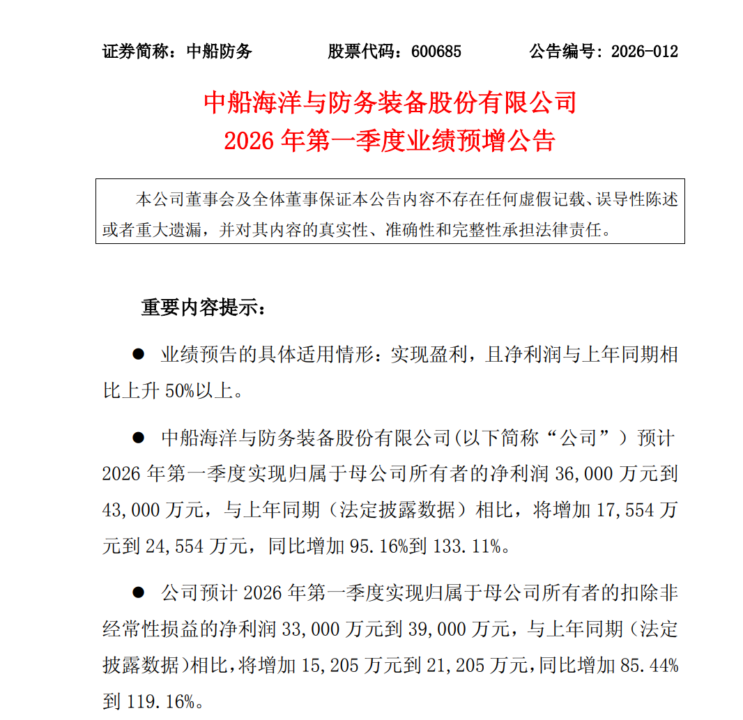 根据公告,中船防务预计2026年第一季度实现归属于母公司所有者的净利润3.6亿元到4.3亿元,与上年同期(法定披露数据)相比,将增加1.7554亿元到2.4554亿元,同比增加95.16%到133.11%。中船防务预计2026年第一季度实现归属于母公司所有者的扣除非经常性损益的净利润3.3亿元到3.9亿元,与上年同期(法定披露数据)相比,将增加1.5205亿元到2.1205亿元,同比增加85.44%到119.16%。中船防务表示,2026年第一季度业绩预增的主要原因包括:报告期内,该公司把握船舶行业发展机遇,订单承接态势良好,产品结构不断优化;持续深化精益生产管理,主建船型建造周期进一步压降,推动营业收入稳步增长,产品毛利同比增加;该公司联营企业经营业绩显著提升,确认投资收益同比大幅增加。