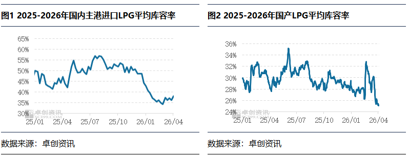 3月国内液化气市场在低库存与地缘局势紧张的双重支撑下,价格呈现易涨难跌特征。炼厂库容率月末降至25.95%,较上月末下降4.73个百分点;月末主港库容率35.89%,环比微升1.71个百分点。进入4月,随着美以伊三方达成临时停火共识,地缘溢价逐步回吐,液化气市场面临回调压力,但低库存环境仍为价格提供一定底部支撑。