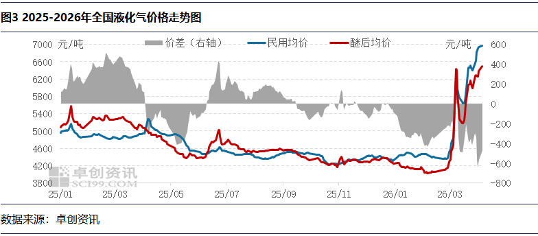 2026年3月国内液化气商品量预估值为168.48万吨,环比增加6.81%;日均商品量为54347.6吨(2月为56331);总量提升,但日均商品量有所下滑。从需求角度来看,3月国内液化气市场需求与库存呈现清晰的阶段性负相关关系,上旬受地缘局势紧张刺激,下游备货积极,需求集中释放,库存显著下降。中旬价格高企抑制接货意愿,需求跟进不足,库存由降转升。下旬局势再度紧张,刚需及避险采购回暖,需求边际改善,库存重回去化通道。总体而言,需求节奏直接主导了库存波动方向,两者反向联动特征明显。