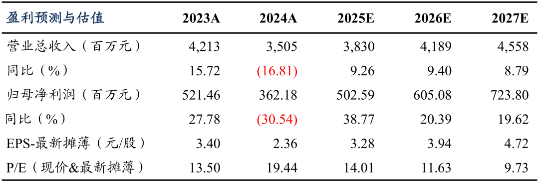 医药商业:公司积极拓展 SPD 等附加价值更高的创新业务,同时减少盈利较差的流通业务,我们预计商业规模小幅增长,但盈利能力有所改善。综合来看,我们预计 2025-2027 年公司工业收入增速为 17%/16%/14%;公司营业总收入为 38.3/41.9/45.6 亿元,同比增速为 9.3%/9.4%/8.8%。公司产品结构逐步优化,随