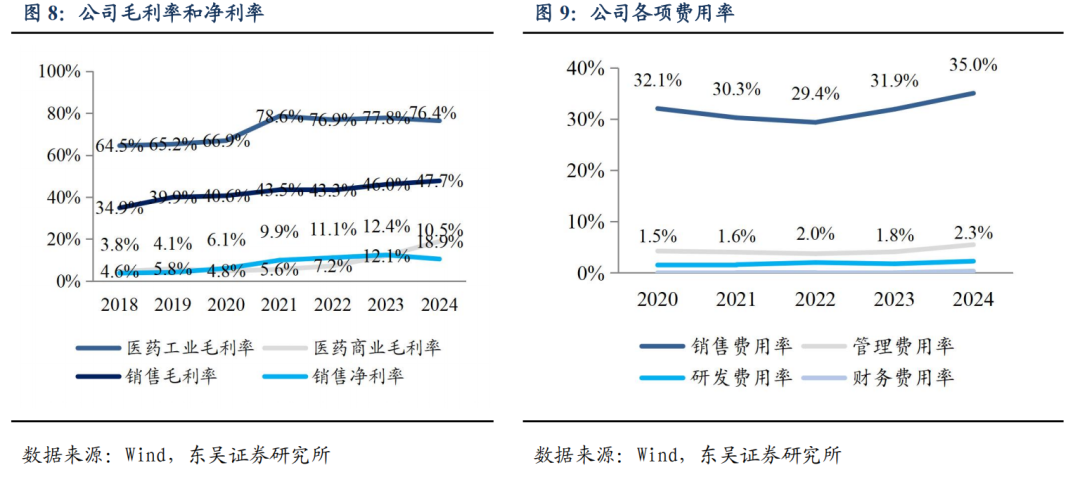 盈利能力稳中向好。公司医药工业的毛利率 2021 年以来稳定在 75%以上,2024 年虽略有下滑但仍维持在 76.36%的水平;医药商业的毛利率逐步提升,主要系公司对医药流通的业务盈利性加以调整,积极拓展 SPD 等附加价值更高的创新业务。销售费用方面,2024 年是公司进行“龙牡”和“健民”的双品牌建设的元年,公司维持较强的广告投放力度,以连接目标消费群体,提高品牌力,2024 年销售费用率为 35.04%,较 2023 年提升 3.13 个百分点,我们认为,后续公司会持续品牌建设投入,随着老产品的品牌力提升以及新产品逐步起量,公司销售费用率将有望稳中有降。