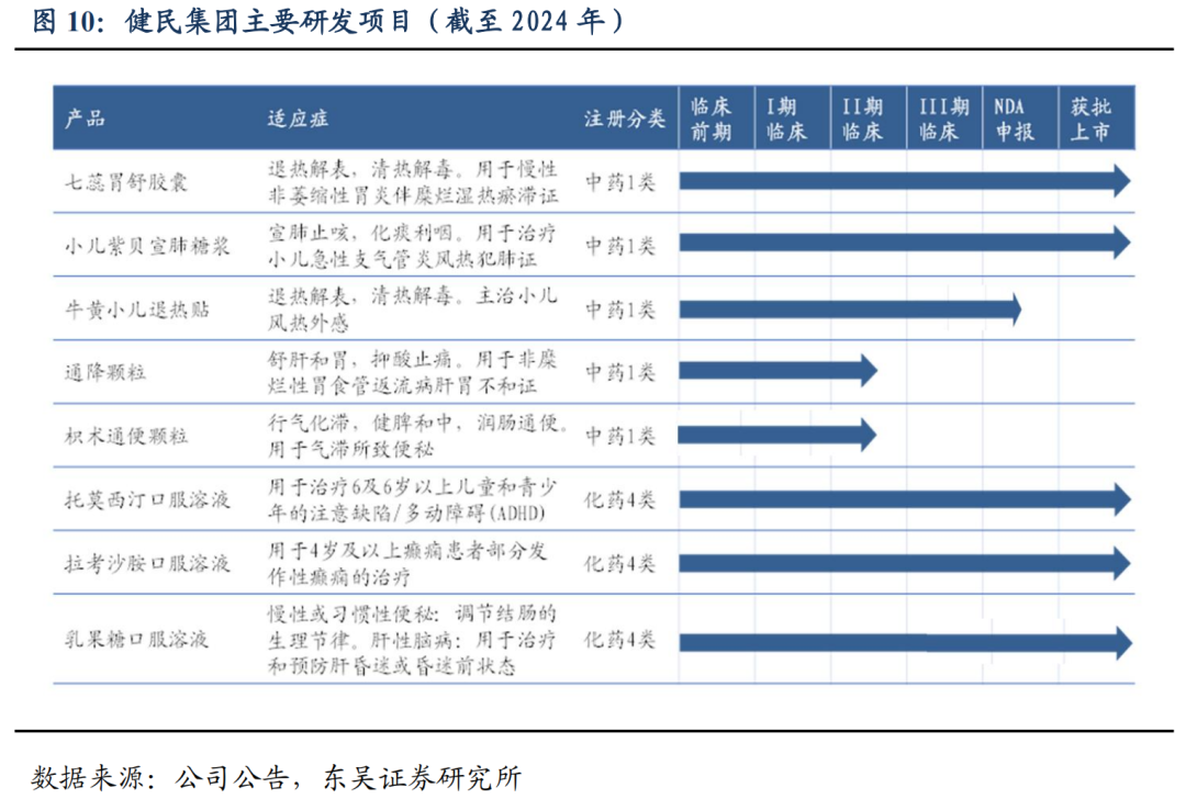 公司加快在研项目进程,加大新产品立项。2021 年全国获批 9 款中药创新药,包括公司的 1.1 类创新中药七蕊胃舒胶囊;2022 年,中药 1.1 类新药通降颗粒也获得 NDA受理,两款新药旨在填补国内治疗胃病的中成药市场空白。2023 年,中药 1.1 类新药小儿紫贝宣肺糖浆、儿科制剂盐酸托莫西汀口服溶液、拉考沙胺口服溶液获批上市,中药1.1 类创新药牛黄小儿退热贴已报产,枳术通便颗粒取得 IND,乳果糖口服溶液获得ANDA 受理,7 项化药制剂完成中试研究。2024 年乳果糖口服溶液、普瑞巴林口服溶液等获批上市,在研项目快速推进。截至 2024 年,公司在研项目 51 项,其中新药研发项目 31 项,二次开发项目 19 项。公司在中药创新药管线上已构建儿童药、消化、呼吸等在研产品梯队,覆盖常见病、多发病等领域,将为处方线的持续发展提供更多有竞争力的产品补充。
