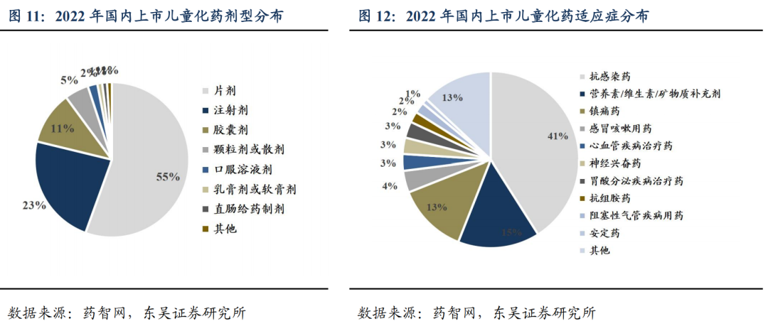 中国儿童药物市场专用品种少、适宜剂型少、生产企业少,市场需求亟待解决。儿童用药与成人用药差异大,目前市场缺乏儿童适用的剂型和规格,现有药物适应症覆盖不够全面。儿童药是指 14 岁以下未成年人所使用的药品,目前可分为儿童专用药和儿童适用药。从身体发育角度来看,儿童多器官发育不完全,药物的吸收、代谢以及排泄过程都和成人有所不同,比如儿童血脑屏障不成熟、代谢酶不稳定、胃肠动力小、肾功能不稳定等,对药物更为敏感,耐受性较差,导致药物研发有难度。从依从性来看,儿童对药品适宜性要求高,而市面上仍多以普通片剂、注射剂、胶囊剂为主,缺乏儿童适用的咀嚼剂、散剂等。从适应症来看,我国儿童用药仍以抗感染药、营养素/维生素等为主,缺乏治疗神经、心血管、内分泌、血液等多个系统的药品,同时缺乏儿童专用特药。据药智网统计,截至 2022 年,中国上市的儿童化药按批文计有约 4000 个,按品种计有约 1300 个,按活性组分有约 1300 个,且主要以处方药为主,占比 86%,儿童用药的稀缺问题亟待解决。