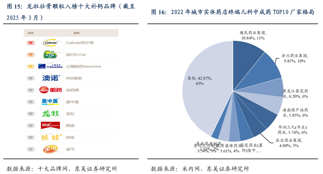 龙牡壮骨颗粒的市场认可度高,儿科终端销量领先。十大品牌榜数据显示,截至2025 年 3 月,龙牡品牌位居儿童补钙领域 TOP10,且是上榜品牌中唯一的中药品牌。根据米内网数据,2022 年中国零售药店终端儿科中成药销售额超过 72 亿元,其中实体药店儿科中成药 TOP10 厂家中,健民集团占据 10.84%的市场份额,市场地位稳固。