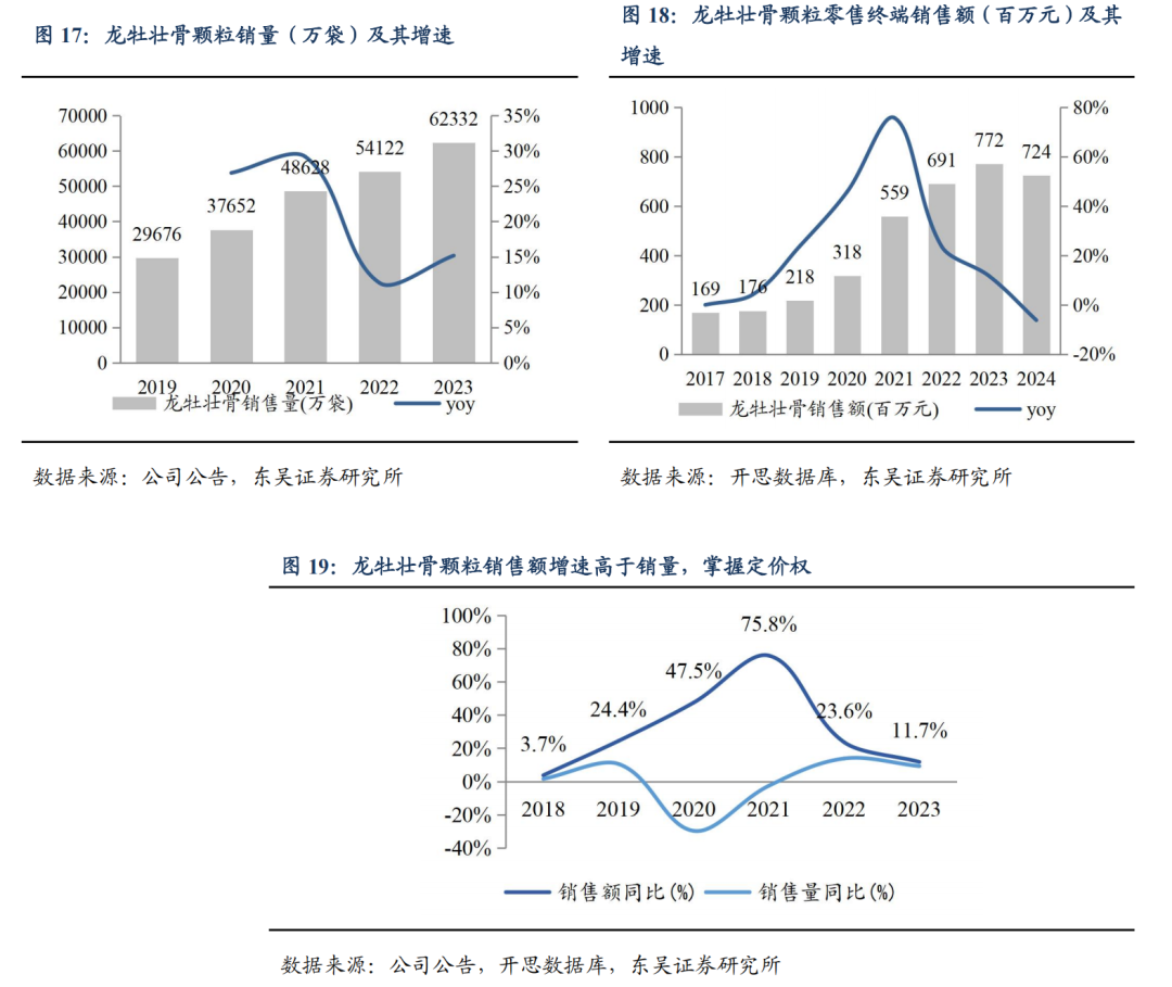 龙牡品牌积极调整销售策略,2024 年主动降低渠道库存,终端需求好于发货端。基于多年的品牌运营经验,公司敏锐察觉,随着收入结构、消费力、城镇化程度、核心消费人群的转变,消费者的消费意识在不断升级。2020 年龙牡壮骨颗粒研发团队综合用户需求与市场导向,从疗效验证、道地药材、口味、工艺、包装上,进行全面的升级改良,推出了新一代龙牡壮骨颗粒。自 2020 年焕新包装的策略实行以来,销量袋数与销售收入额同步增长,且销售额增长速度快于销售量,公司品牌掌握市场定价权,呈现量价齐升的良好趋势。根据年报数据,2023 年销量超过 6.2 亿袋,同比增长 15.2%,2019-2023 年年均复合增速为 20.4%。2024 年,儿科产品销售量下滑 32.44%,主要系龙牡壮骨颗粒为减少渠道库存导致销售发出下降所致。从终端数据来看,根据开思数据库,2023 年零售端的销售收入达 7.7 亿元,2019-2023 年 CAGR 为 37.2%,2024 年零售终端销售额为 7.24 亿元,同比下滑 6%,好于发货端的情况。院内渠道来看,《国家医保目录(2023 年)》中取消了龙牡壮骨颗粒“限小儿佝偻病”的报销范围限制,对药品在医院的销售与推广起到积极的促进作用。