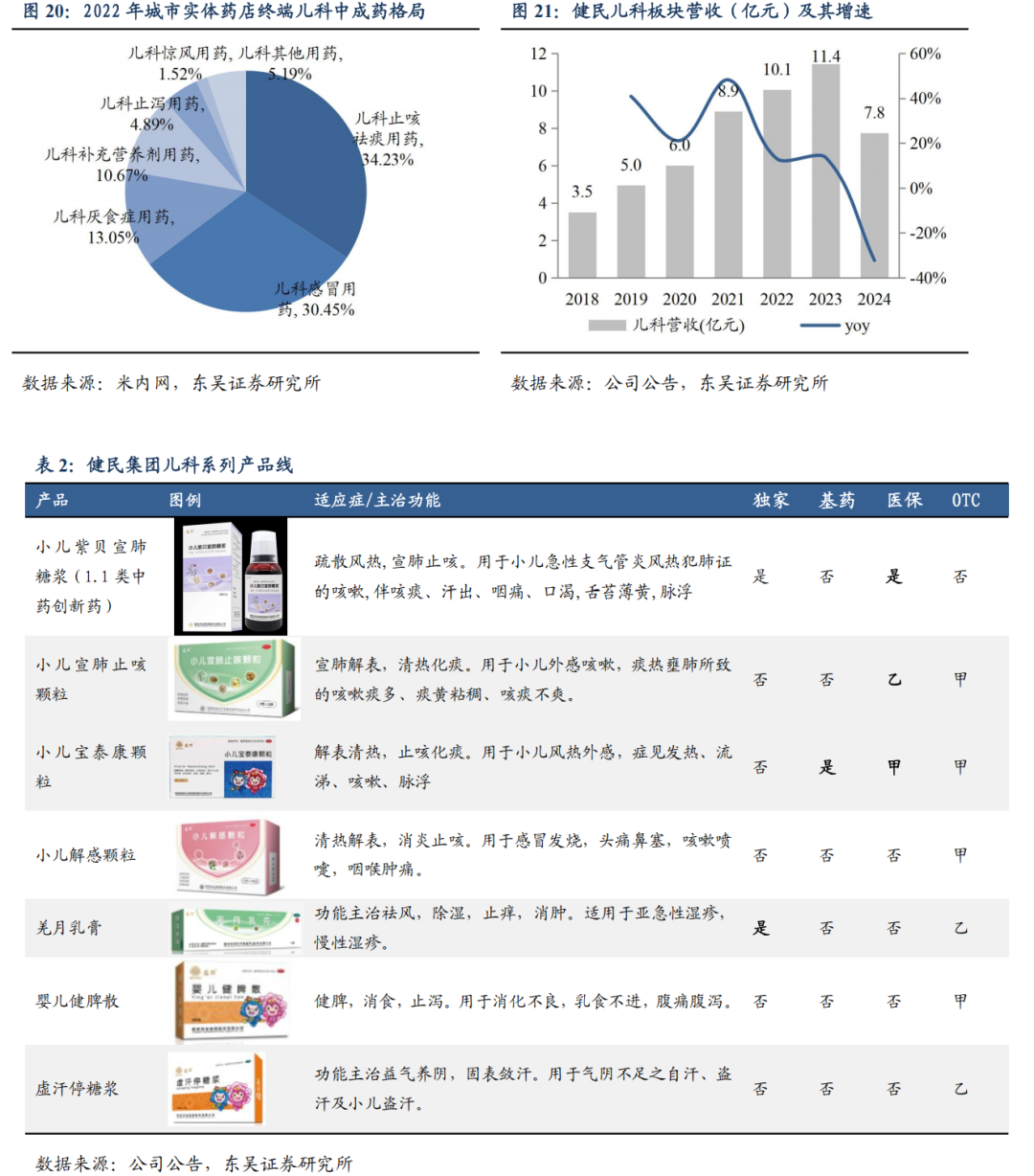 公司抓住儿童常见咳嗽感冒类用药机会,实现儿科板块快速增长。2023 年,健民儿科板块实现营收 11.4 亿元( 13.6%),2018-2023 年 CAGR 为 26.6%。儿科产品线除了龙牡壮骨颗粒,其余主要品种为治疗小儿感冒咳嗽类药品,包括小儿宣肺止咳颗粒、小儿宝泰康颗粒、小儿解感颗粒等。根据米内网,从儿科用药细分领域上看,儿科止咳祛痰用药、儿科感冒用药是儿科中成药实体药店市场的销售主力,2022 年两者合计市场份额达 64.69%;儿科厌食症用药、儿科补充营养剂用药市场份额均超过 10%。公司儿科系列产品不断丰富,1.1 类中药创新药小儿紫贝宣肺糖浆获批且医保谈判成功,后续有望带来新的增量。