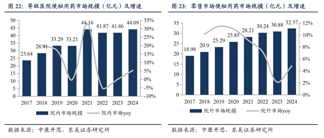 便秘作为国民常见病,中成药零售市场空间持续扩容。便秘是一种常见、易发的疾病,根据《中国慢性便秘专家共识意见(2019)》,我国成人慢性便秘的患病率为 4%~10%,约有 5000 万成人受便秘困扰。便秘症状尤以中老年人最为常见,发病率随着年龄的增长而升高,60 岁以上人群慢性便秘患病率高达 22%。近年来,中成药在便秘中的治疗作用以独特优势,逐步取代容积性泻剂、润滑性泻剂、盐类泻剂、渗透性泻剂和刺激性泻剂等西药,被越来越多的学界和患者所认可。目前我国已步入人口老龄化阶段,结合近年来中老年便秘发病率逐年升高的趋势,未来便秘用药市场空间大。根据中康开思数据,2024 年,院内治疗便秘的药物市场销售规模达 44.09 亿元( 5.3%),其中,中成药占比 19.8%,占比呈现提升趋势(2017 年中成药占比 14.5%);2024 年全年,便秘相关药物院外销售规模为 32.4 亿元( 4.8%),其中,中药占比 50.3%。便通胶囊位居院外销售额 top5,且增速亮眼。