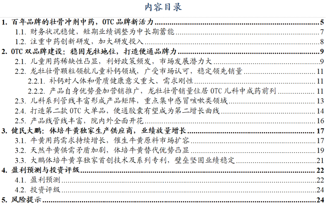 儿科:(1)龙牡壮骨颗粒作为中国城市实体药店终端儿科中成药品牌 TOP1,品牌优势强劲。公司 2023-2024 年进行龙牡壮骨的渠道控制、库存管理、以及营销团队改革,我们预计短期内龙牡壮骨颗粒增速有所调整,后续收入增速逐步回升。(2)公司儿科领域多产品布局,小儿紫贝宣肺糖浆通过谈判首次纳入国家医保目录,小儿牛黄退热贴已进入报产阶段,均有望成为新增长点。