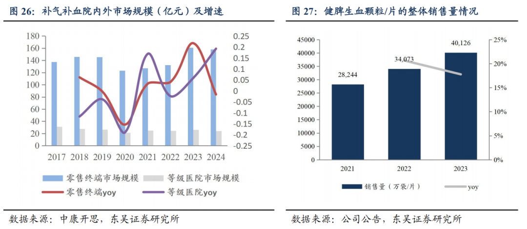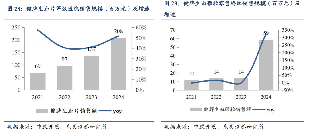 补气补血类产品需求旺盛,健脾生血院内院外均稳步放量。根据中康开思数据,近年来补气补血市场规模不断扩容,其中,院外市场较大,2024 年市场规模超 158 亿元;院内市场自 2022 年逐步回升,2024 年,市场规模为 24 亿元,同比增长 19%。健脾生血颗粒/片适应症为健脾和胃,养血安神,用于小儿脾胃虚弱及心脾两虚型缺铁性贫血、和成人气血两虚型缺铁性贫血,是中华医学会《铁缺乏和缺铁性贫血诊治和预防多学科专家共识》唯一推荐中成药,荣获武汉名品认定。公司优化销售模式,提升医疗机构的覆盖率,2023 年健脾生血颗粒/片实现销售量同比增长 18%。分剂型来看,健脾生血颗粒院外市场开始放量,片剂在院内稳健增长。