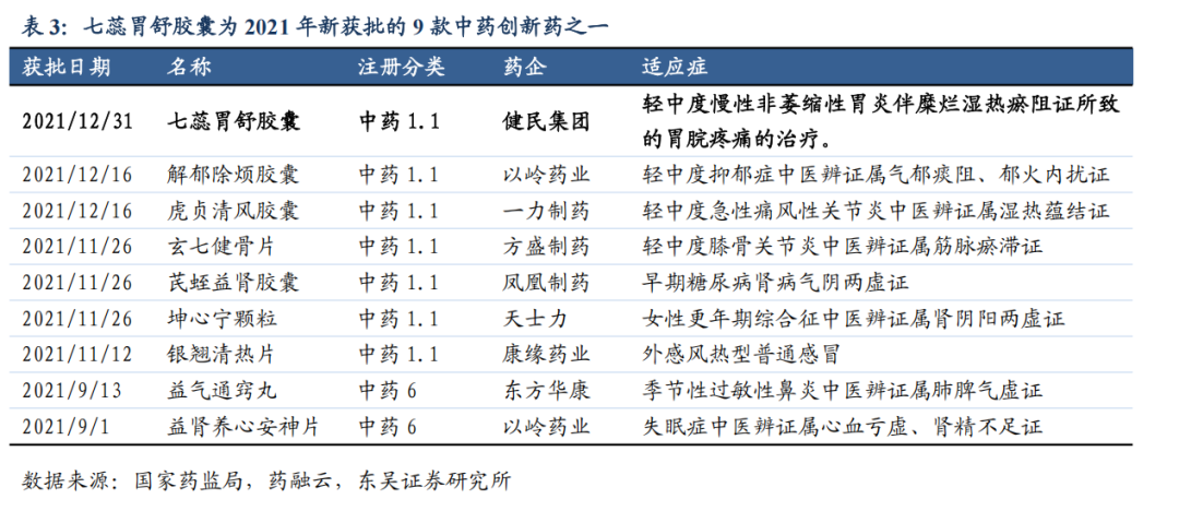 七蕊胃舒胶囊,活血化瘀,燥湿止痛。用于轻中度慢性非萎缩性胃炎伴糜烂湿热瘀阻证所致的胃脘疼痛,舌质紫黯或瘀斑瘀点、舌苔黄腻、脉弦涩或弦滑。是健民集团 2021年底获批上市的中药 1.1 类新药。2021 年全国新获批 9 款创新中药,七蕊胃舒胶囊为其中之一。该品种上市将为慢性胃炎患者提供新的治疗选择。2022 年作为销售首年,七蕊胃舒胶囊销售 329 万元,且 2023 年 1 月通过谈判进入《国家医保目录(2022 版)》。