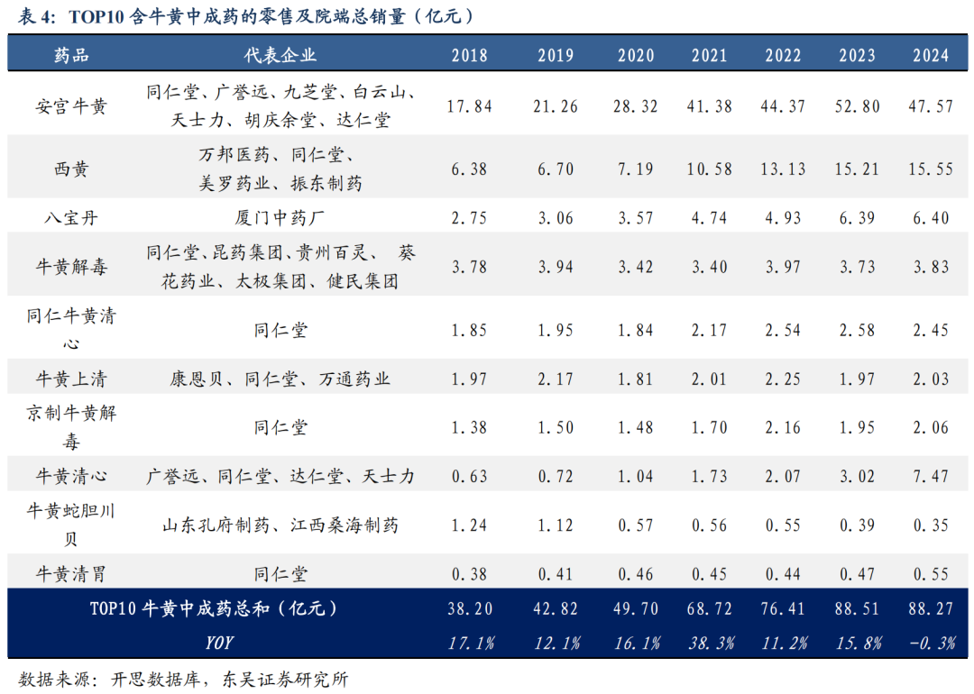 含牛黄(包括天然牛黄、体培牛黄、人工牛黄)中成药市场不断增长,催生牛黄原料需求扩容。牛黄中含有胆酸、胆红素、卵磷脂、铁等多种无机盐微量元素、和人体所需的氨基酸等40多种主要有效成分。牛黄用途广泛,具有清心、开窍、豁痰、清热解毒、凉肝、息风等功效,广泛应用于高热、昏迷、抽搐、中风、痰厥、癫痫等病症。药典很少为牛黄单味,多是与中药配伍,可制成针对多种人体的功能性疾病、疑难杂症的中成药物,包括治疗恶性肿瘤的抗癌药物、防治艾滋病药物、戒毒药物等。牛黄需求量大,我国以牛黄作为主要原料的中成药和保健药品,包括42种名贵中成药,和650多个品种的国家标准药品,如安宫牛黄丸、大活络丸、局方至宝散、牛黄清热散、牛黄清心丸、片仔癀、人参再造丸、麝香保心丸等。
