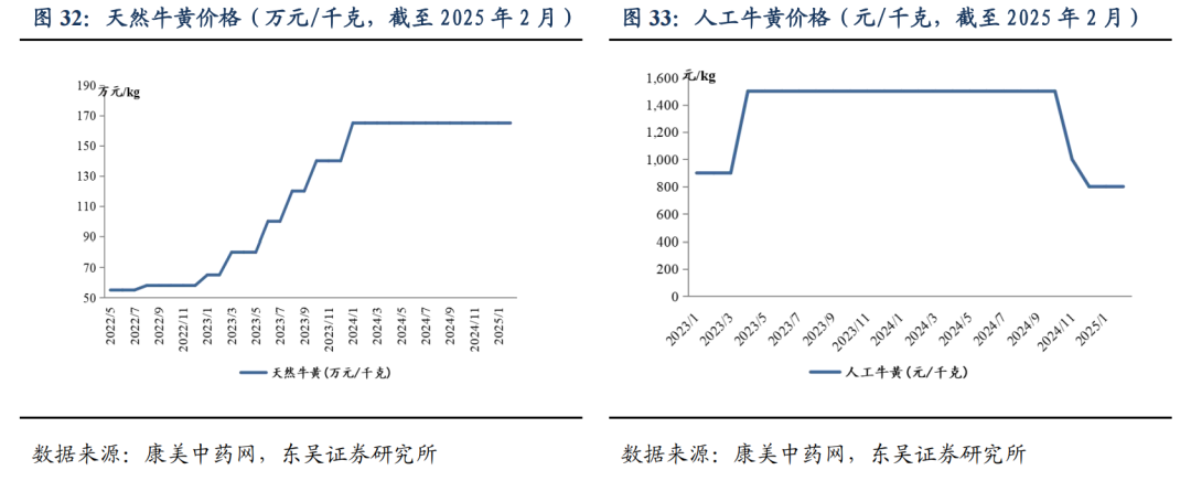 天然牛黄价格昂贵且持续走高,众多中成药成本持续上涨。市场天然牛黄走动畅快,市场货源紧缺,价格持续走高,众多名贵中药随之涨价,如片仔癀于2023年5月公告,片仔癀锭剂的国内零售价格从590元/粒上调到760元/粒,供应价格相应上调约170元/粒;海外供应价格相应上调约35美元/粒。根据康美中药网,市场天然牛黄价格从23年6月的60万元/公斤涨价至24年6月的160-170万元/公斤,并持续稳定在高位。