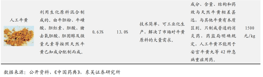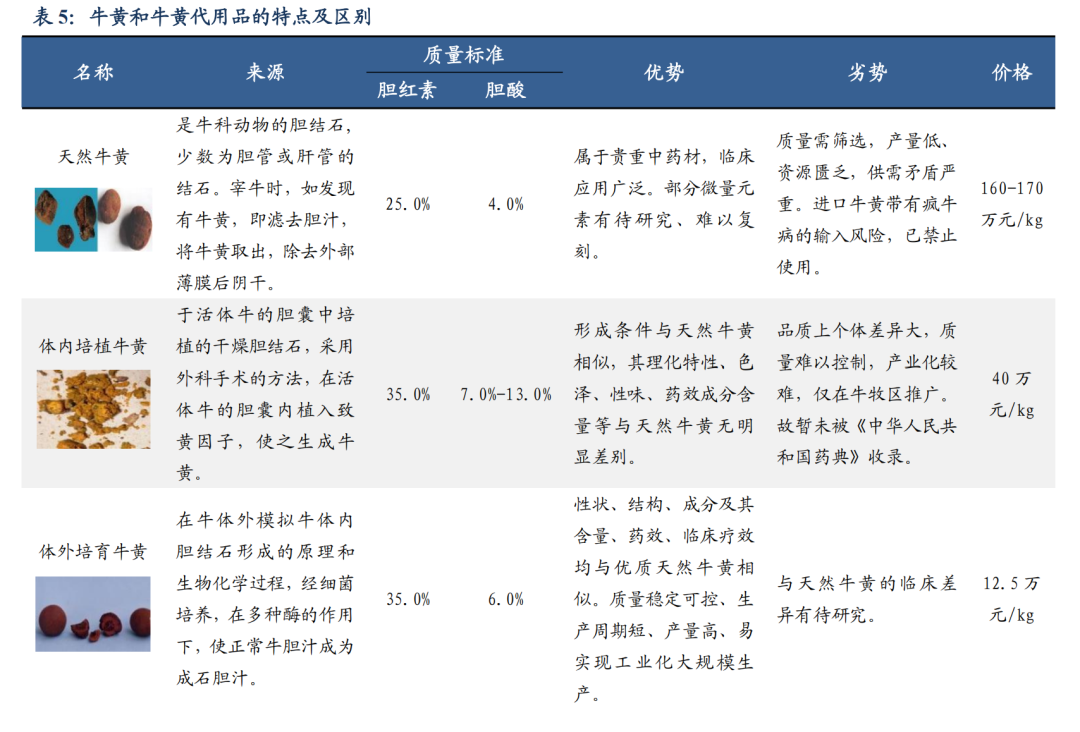 牛黄属于贵重中药材,临床应用广泛,我国中医应用牛黄治病已有 3000 多年的历史。牛黄中含有胆酸、胆红素、卵磷脂、铁等多种无机盐微量元素、和人体所需的氨基酸等 40 多种主要有效成分。牛黄用途广泛,具有清心、开窍、豁痰、清热解毒、凉肝、息风等功效,广泛应用于高热、昏迷、抽搐、中风、痰厥、癫痫等病症。药典很少为牛黄单味,多是与中药配伍,可制成针对多种人体的功能性疾病、疑难杂症的中成药物,包括治疗恶性肿瘤的抗癌药物、防治艾滋病药物、戒毒药物等。牛黄需求量大,我国以牛黄作为主要原料的中成药和保健药品,包括 42 种名贵中成药,和 650 多个品种的国家标准药品,如安宫牛黄丸、大活络丸、局方至宝散、牛黄清热散、牛黄清心丸、片仔癀、人参再造丸、麝香保心丸等。