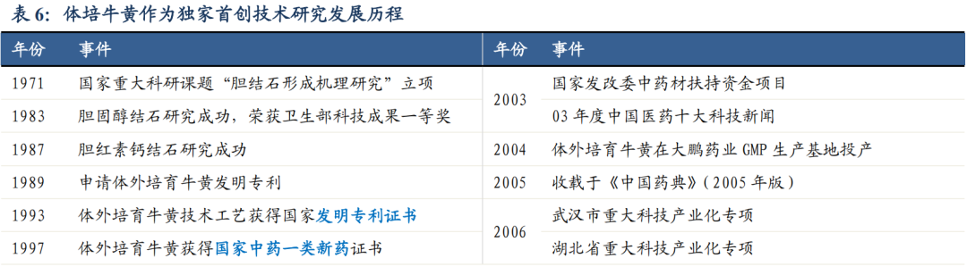 体培牛黄为健民大鹏独家首创技术,专利壁垒地位稳固。健民大鹏独家拥有的自主技术体外培育牛黄为国际首创,是我国中药现代化领域的一项重大发明创新。在已故中科院院士裘法祖教授指导下,华中科技大学同济医院蔡红娇教授等,在体外牛胆汁内培育牛黄成功,1993年取得中国发明专利。1999年,这项专利以约3000万元转让给武汉大鹏药业独家生产。2005年,武汉大鹏药业、健民集团完成重组。随后健民大鹏与武汉大学、华中科技大学、南京中医药大学、天津中医药大学等密切合作,争取国家863重大科技专项,完成了体外培育牛黄替代天然牛黄的研究。多年来健民大鹏持续创新,在原有专利基础上申请了48个专利,覆盖体培牛黄的生产技术、工艺、设备、外观等各领域,同时加强品牌保护,注册了80多个商标。通过专利、商业秘密、行政保护建立了知识产权保护的防火墙,树立了体培牛黄研发壁垒。