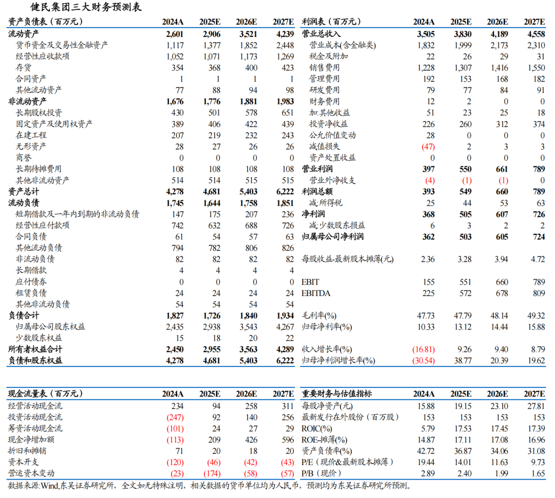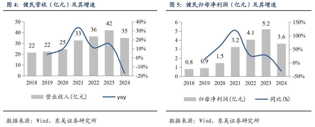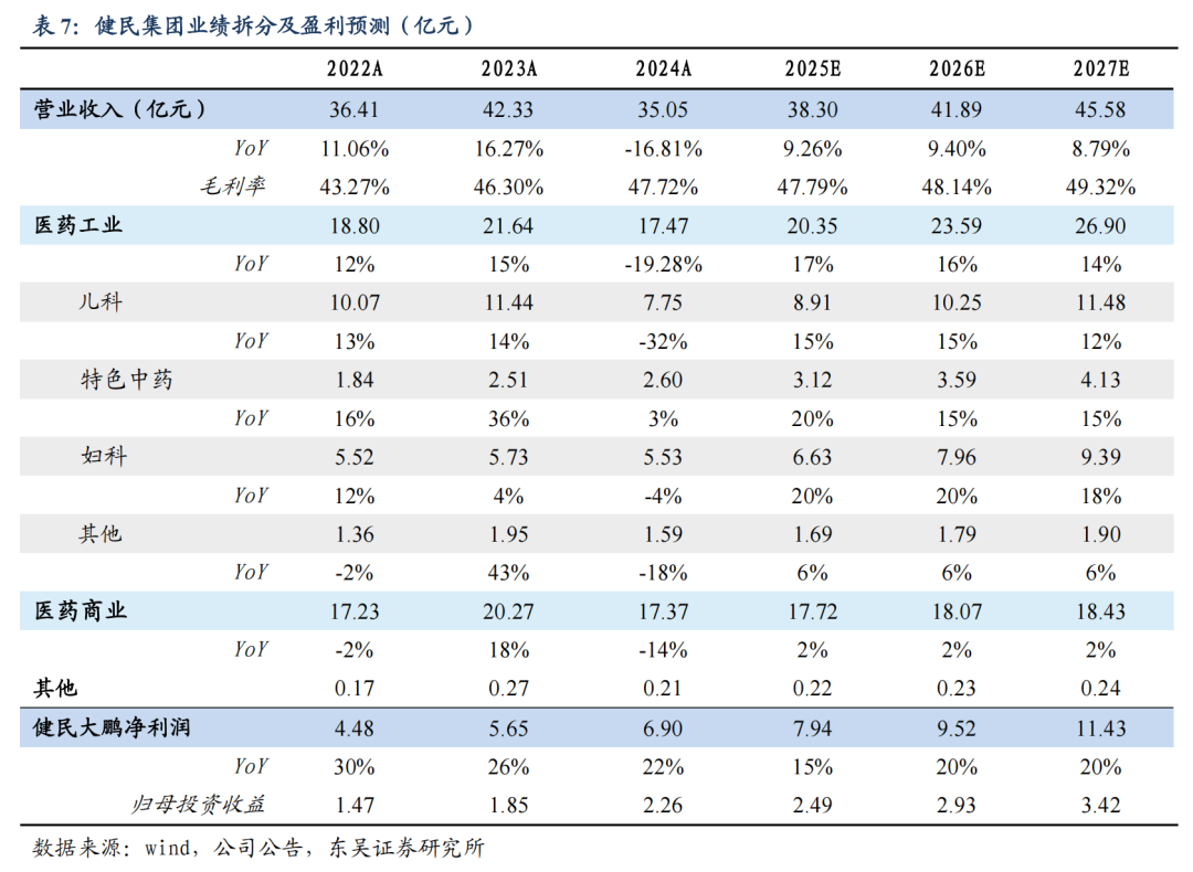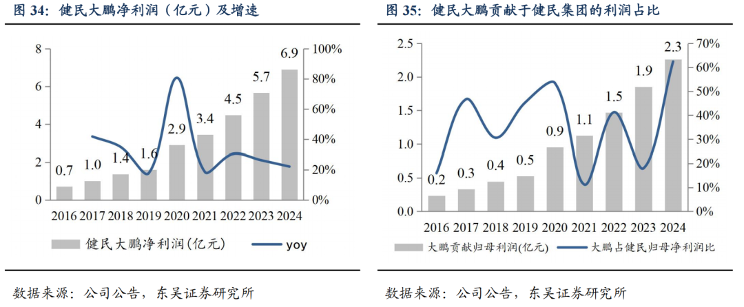 健民大鹏贡献稳定投资收益。2020-2023 年,健民大鹏净利润年均复合增速为 25%,增长势头强劲。2024 年,健民大鹏实现净利润 6.9 亿元( 22%),按照与其他股东的协议约定实际的分红比例 32.76%,归属健民集团的投资收益为 2.3 亿元,利润贡献突出,占健民集团归母净利润的 62%,较 2023 年贡献 18%的利润占比大幅提升,主要系主业下滑,而大鹏利润稳健增长。