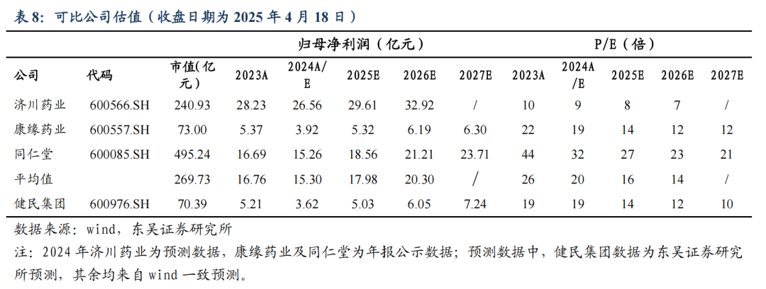公司为国内儿科补钙领域的中成药龙头企业,在 OTC 端具有强品牌力。选择与公司业务相近,均为品牌中药且儿科大单品位居行业前列的济川药业作为可比公司;考虑到公司的中药创新药储备,选择康缘药业作为可比公司,此外,考虑到公司在体培牛黄领域的独有优势,选择牛黄的下游企业同仁堂作为可比公司。我们预计公司 2025-2027年的归母净利润为 5.03/6.05/7.24 亿元,对应当前市值的 PE 为 14/12/10X。公司估值低于可比公司估值平均水平。考虑公司主营业务属于细分龙头,且 2025 年主业业绩有望好转,子公司健民大鹏贡献稳定净利润,估值有望进一步消化,首次覆盖,给予“买入”评级。
