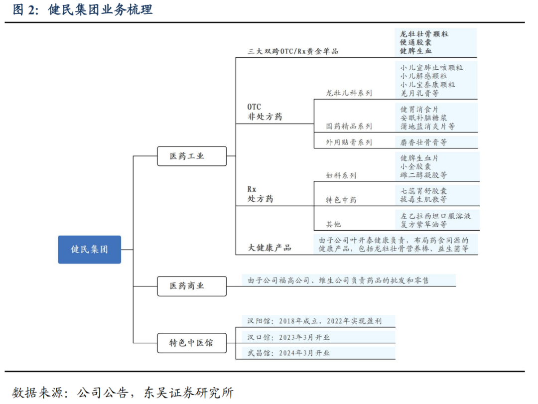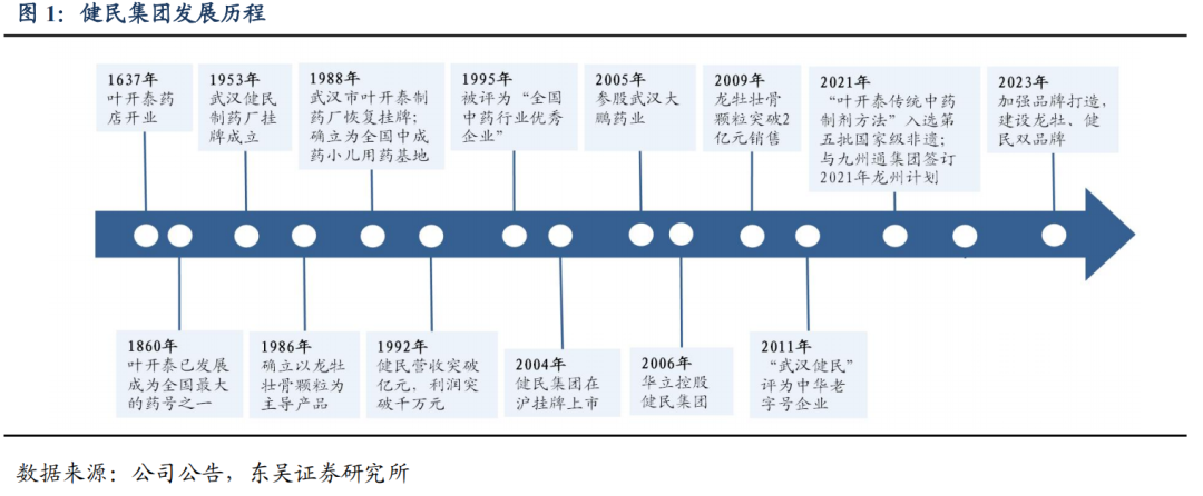 百年历史传承,构筑三大品牌壁垒。健民集团是中药企业中数不多的拥有多个驰名商标的企业,拥有两大中国驰名商标“健民”和“龙牡”。公司前身叶开泰药号,创始于明崇祯十年(1637 年),秉承叶开泰近 400 年历史的中医药文化,品牌影响力在国内位列前茅,是“中华老字号”企业,也是中国四大中药名店之一,享有“初清三杰”、“中国四大药号”的美誉。从 1953 年即开始企业化经营,叶开泰改造为武汉健民药厂。2004 年在上海证券交易所上市。公司多年入选“中国最有价值品牌 500 强”,综合实力位列全国医药企业百强。健民集团以发展中医药为核心,以儿科产品为特色,已成为全国重点中药企业和小儿用药生产基地。