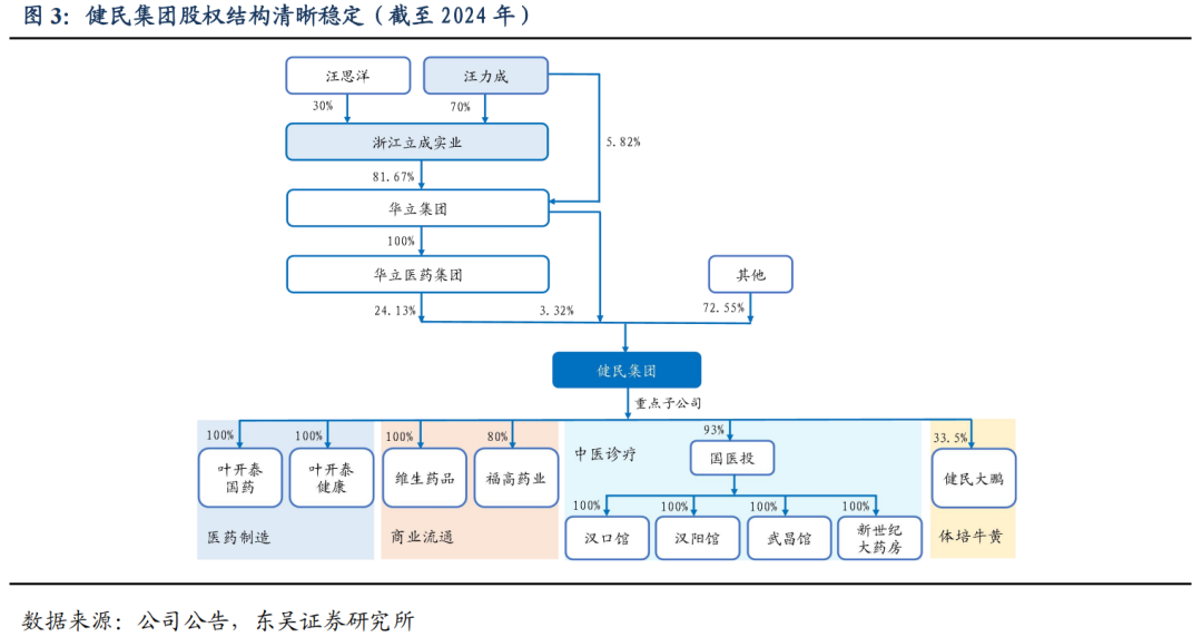 股权结构清晰稳定。公司实控人为汪力成,通过华立集团实现对健民集团的控制。华立集团通过华立医药集团间接持有健民 24.13%的股权,直接持股 3.32%,合计持有27.45%的股权,其余股东较为分散且股权比重较小。
