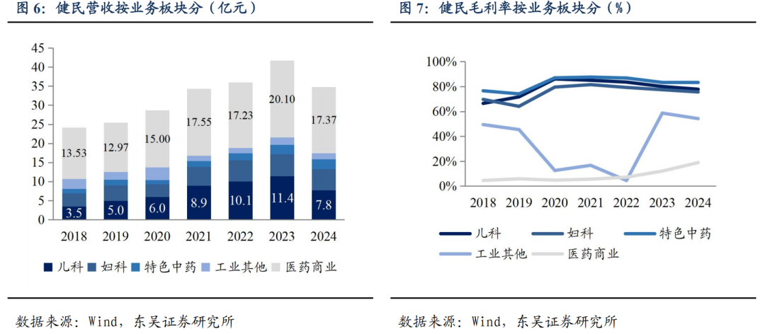 按业务板块来看,儿科、妇科及特色中药为毛利的主要来源。2024 年医药工业占营收比 50%,但贡献了 80%的毛利。按专科领域或药品划分,儿科、妇科用药收入占比较高,2024 年儿科收入 7.75 亿元(-32.25%),占公司总营收的 22%,妇科收入 5.53 亿元(-3.58%),占公司总营收的 16%。特色中药表现相对较好,2024 年营业收入同比增长 3.27%,主要系便通胶囊等产品带动。