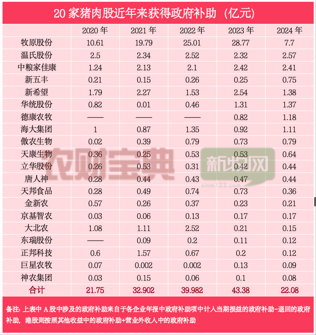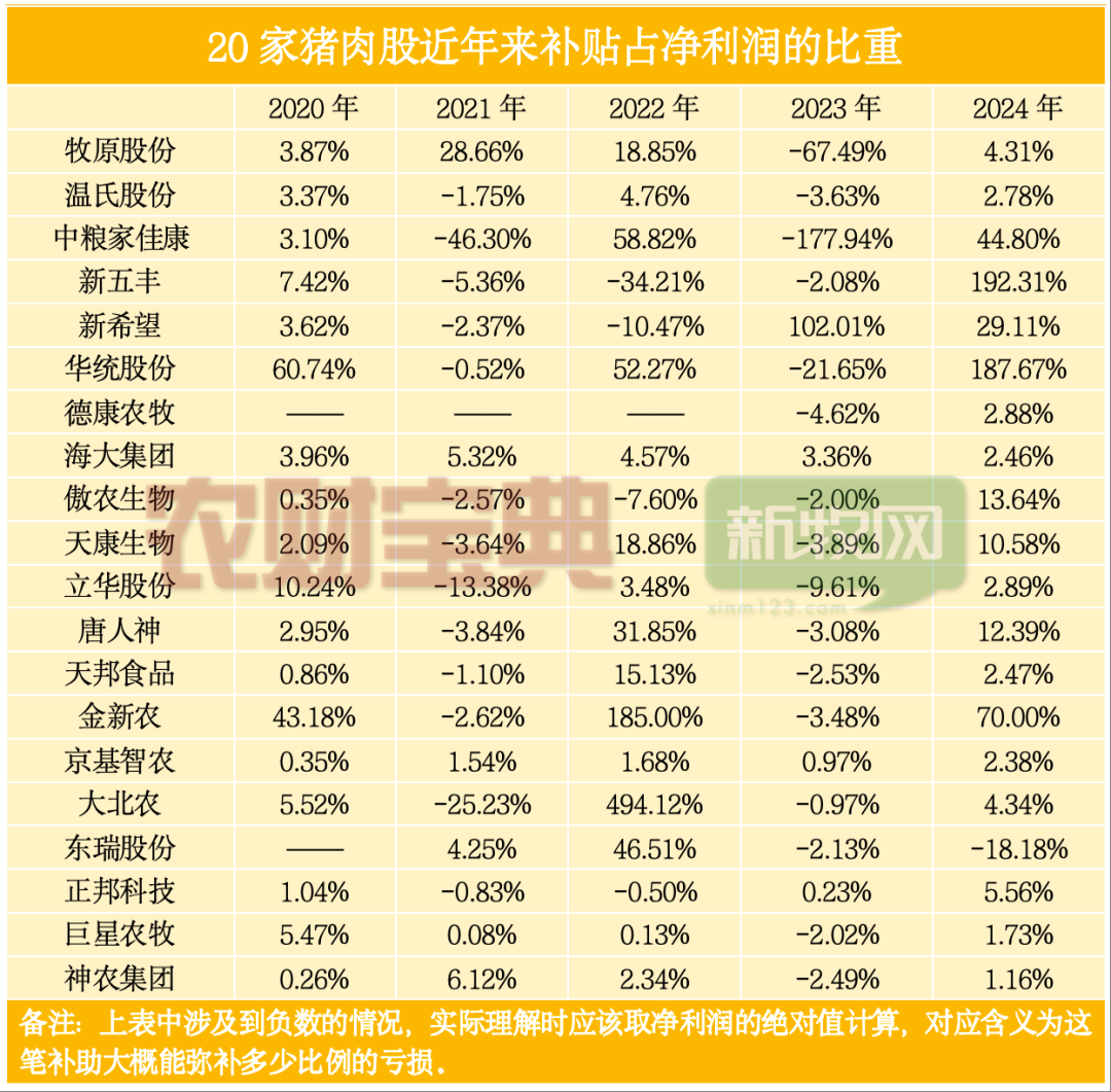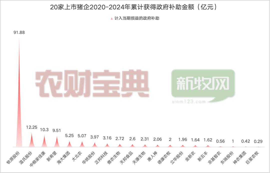 据不完全统计,2020至2024年,国内20家上市猪肉企业累计揽入政府补助超160亿元(计入当期损益的政府补助),在猪周期深度亏损阶段,补助成为龙头企业稳经营、抗风险的关键支撑,有效守住生猪供应基本盘。但数据背后,补助资源高度向头部集中的现实,也引发行业追问:逆周期补贴在托底产业的同时,是否正在拉大上市猪企与中小养殖户的竞争差距,形成新的市场不公平?假如取消补贴,巨头们的日子又会如何?事实上,补助规模随生猪市场周期波动呈现明显的“逆周期调节”特征。数据显示,2020年行业处于高盈利周期,19家企业合计净利润达664.95亿元,当年补助(21.75亿元)占净利润比重仅为3.27%;2021年行业转入亏损,合计净利润-459.86亿元,补助(32.9亿元)占亏损额(459.86亿元)比重提升至7.12%;2023年行业再次陷入深度亏损,补助(39.98亿元)占亏损额(153.63亿元)比重进一步提升至28.92%,充分体现了政策对行业的精准扶持。具体来看,2020年,正值非洲猪瘟后猪价飙升至历史高位的超级景气期,20家猪企合计净利润高达676.33亿元,政府补助总额为21.75亿元。彼时,补贴之于牧原股份(10.61亿元)这样的盈利大户,不过是锦上添花——其当年净利润高达274.51亿元,补贴占比仅为3.87%。然而,2021年成为转折点。随着产能集中释放,猪价从年初的36元/公斤断崖式下跌至10元/公斤,行业陷入深度亏损。20家猪企合计亏损457.41亿元,但政府补助却逆势增长至32.90亿元。2022年至2023年,行业在周期底部挣扎。2023年成为“史上最惨淡的猪周期”,20家企业亏损超550亿元。正是在这样的至暗时刻,政府补助规模攀至峰值——2023年20家猪企合计获得43.38亿元补助,较2020年翻倍,相当于平均每家获得2.28亿元补助。牧原股份的补贴轨迹尤为典型:从2020年的10.61亿元,一路增长至2023年的28.77亿元,增幅达171%。2023年,当公司陷入上市以来首次亏损(-42.63亿元)时,这笔巨额补贴相当于其亏损额的67.5%,成为重要的”止血带”。在政府补助的分配格局中,头部企业占据了绝对主导地位。数据显示,牧原股份作为行业龙头,2020-2025年(2025年为部分数据)累计获得政府补助达97.26亿元,其中2020-2024年五年间获得91.88亿元,年均补助超过18亿元。这一金额不仅远超同行,更相当于同期其他18家企业补助总和的1.8倍。从市场行情来看,这种补助倾斜在产能过剩、产能调减期表现得尤为明显。2021年生猪价格断崖式下跌,行业经历“最强猪周期”下行阶段,牧原股份当年获得19.79亿元补助,较2020年增长86.5%;2023年行业再度陷入深度亏损,公司补助金额进一步攀升至28.77亿元,创五年来新高。与之形成对比的是,行业盈利较好的2024年,随着生猪价格回升至16-18元/公斤的合理区间,牧原股份的补助金额回落至7.70亿元,回归相对正常水平。补贴的意义不仅在于弥补亏损,同时也为头部企业在低价期不减产反而扩张提供了帮助。2023年数据显示,在19家上市猪肉企业中,有14家出现净利润亏损,合计亏损额达149.62亿元。正是在这样的背景下,政府补助成为多家企业缓解经营压力的重要支撑。比如,中粮家佳康2023年获得2.42亿元政府补助,而公司当年净利润为-1.36亿元,补助金额相当于亏损额的177.94%,有效覆盖了全部亏损并有余力支持企业发展。此外,新希望2023年获得2.54亿元补助,当年净利润为2.49亿元,补助占净利润的比重高达102.01%,若剔除补助因素,公司将陷入亏损境地。即使是行业龙头牧原股份,补助的作用也不容忽视。2023年公司获得28.77亿元补助,当年净利润为-42.63亿元,补助弥补了67.49%的亏损额,极大减轻了企业的现金流压力。华统股份、德康农牧等企业的补助占亏损额比重也分别达到21.65%和4.62%,为企业渡过行业寒冬提供了重要保障。尽管政府补助对稳定行业发展发挥了重要作用,但补助资源向头部企业集中的现象,也引发了关于行业公平性的讨论。如图所示,这种高度集中的分配格局,使得广大中小养殖户难以享受到同等的政策支持。从市场竞争角度来看,头部企业凭借规模优势获得更多补助后,能够进一步加大在养殖设施升级、环保投入、技术研发等方面的投资,从而在市场竞争中占据更有利地位。2023年,牧原股份单家企业获得的补助(28.77亿元),相当于同期18家上市猪肉企业补助总和的1.9倍,这种差距在非上市的中小养殖户群体中可能更为悬殊。在生猪价格周期性波动的市场环境下,这种补助差距进一步加剧了行业分化。当市场陷入低迷期,获得大额补助的头部企业有更强的资金实力维持生产规模,甚至可以通过适度扩张来抢占市场份额;而缺乏补助支持的中小养殖户,则面临更大的资金压力,部分企业可能因无法承受持续亏损而退出市场。2021-2023年的行业调整期内,国内生猪养殖行业的集中度显著提升,与这种差异化的补助支持或许存在一定关系。站在2026年的门槛回望,这轮史上最漫长的猪周期(从2020年高点算起,下行周期长达64个月)反映出更深层的问题:毋庸置疑,补贴确实发挥了“稳产保供”的作用。在2023年全行业亏损的背景下,若无政府补助托底,不排除有更多大型猪企会步雏鹰后尘,引发更剧烈的产能波动和就业冲击。与此同时,也要看到中小养殖户的诉求,他们需要的或许不是与巨头争夺补贴份额,而是一个更公平的竞争环境。毕竟,一个健康的生猪养殖业,不应只是巨头的江湖,而应是各类市场主体共生共荣的生态