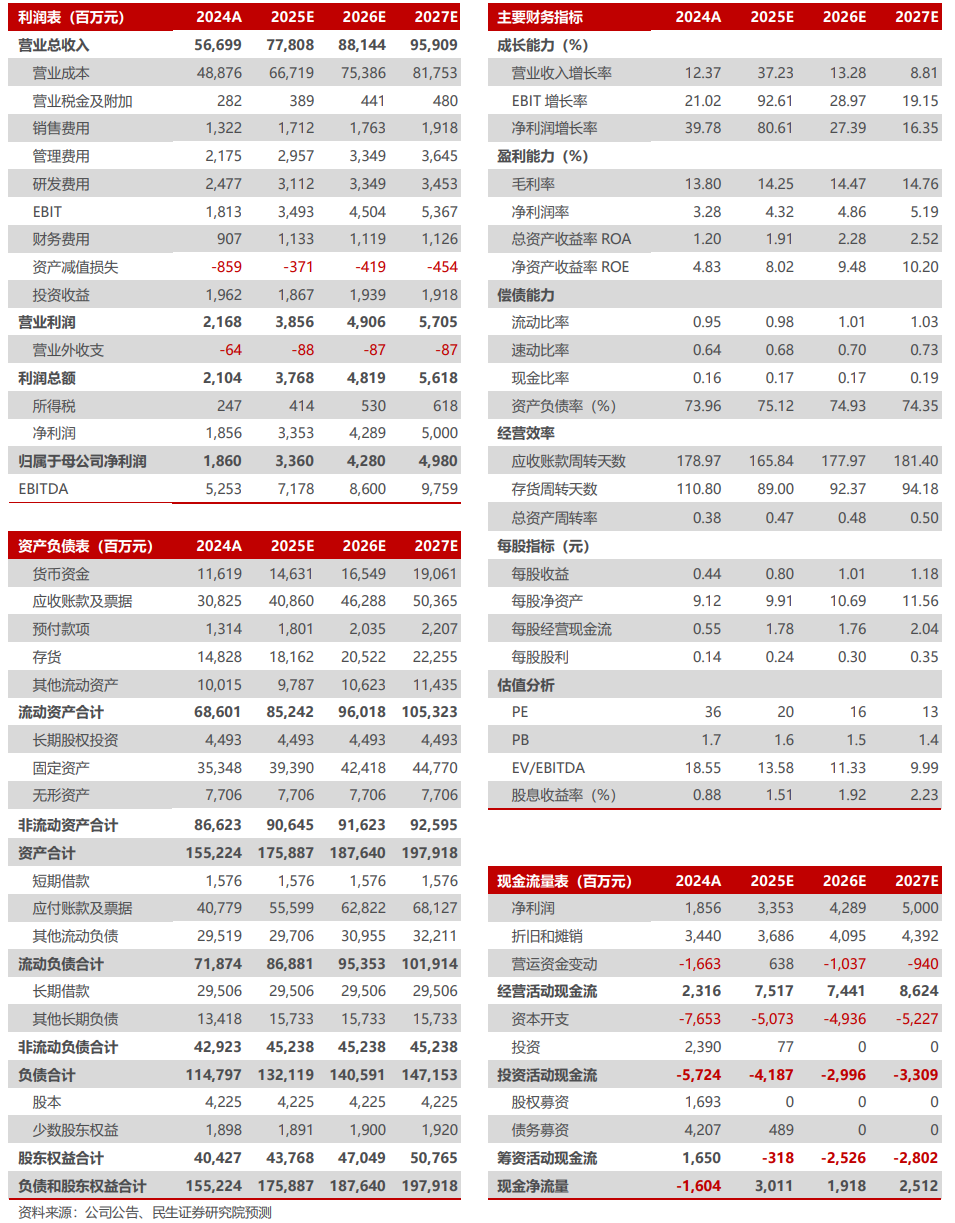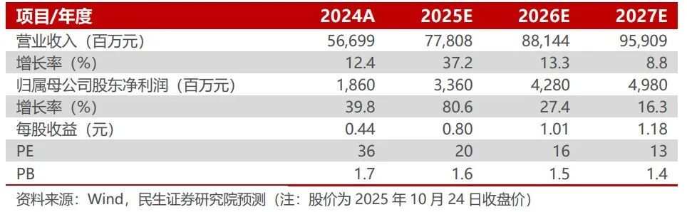 ■ 投资建议:我们预计公司2025-2027年营收分别为778.1、881.4、959.1亿元,增速为37%/13%/9%;归母净利润分别为33.6、42.8、49.8亿元,增速为81%/27%/16%,对应25-27年PE为20x/16x/13x,维持“推荐”评级。