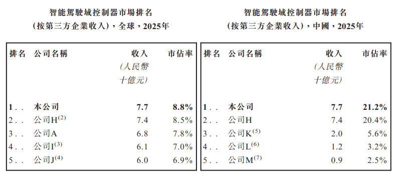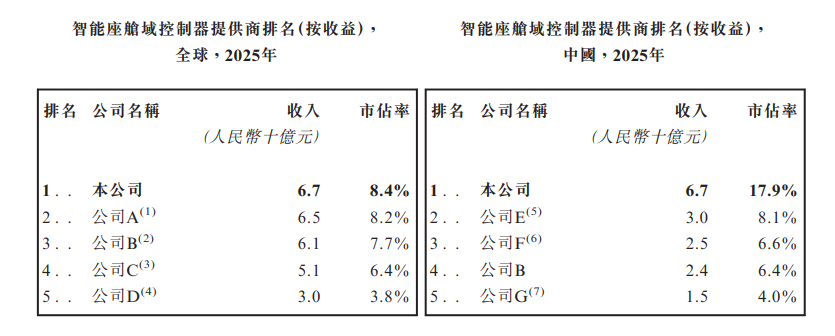 根据弗若斯特沙利文的数据,2025年按收入计,德赛西威在中国智能座舱域控制器市场以17.9%的份额排名第一,在全球市场以8.4%的份额同样位列榜首。智能驾驶域控制器方面,在第三方供应商中,德赛西威以21.2%的份额稳居中国第一,以8.8%的份额位列全球第一。2025年上半年,其高算力域控制器产品的全球市占率约为26.1%。