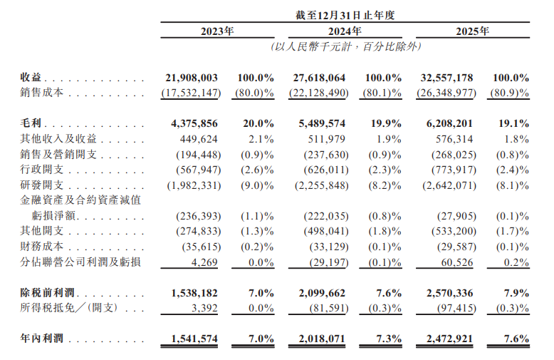 招股书显示,2023年至2025年,德赛西威营收从219.08亿元增长至325.57亿元,三年累计增长48.6%,复合年增长率21.9%。同期净利润从15.42亿元增至24.73亿元,三年净赚60.33亿元。净利率从7.0%微升至7.6%,盈利能力略有改善但幅度有限。