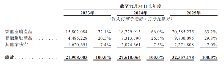 更值得关注的是业务结构的深刻变化。智能座舱业务依然是收入主力,2025年贡献205.85亿元,占总营收的63.2%。但这一占比已从2023年的72.1%持续下滑。