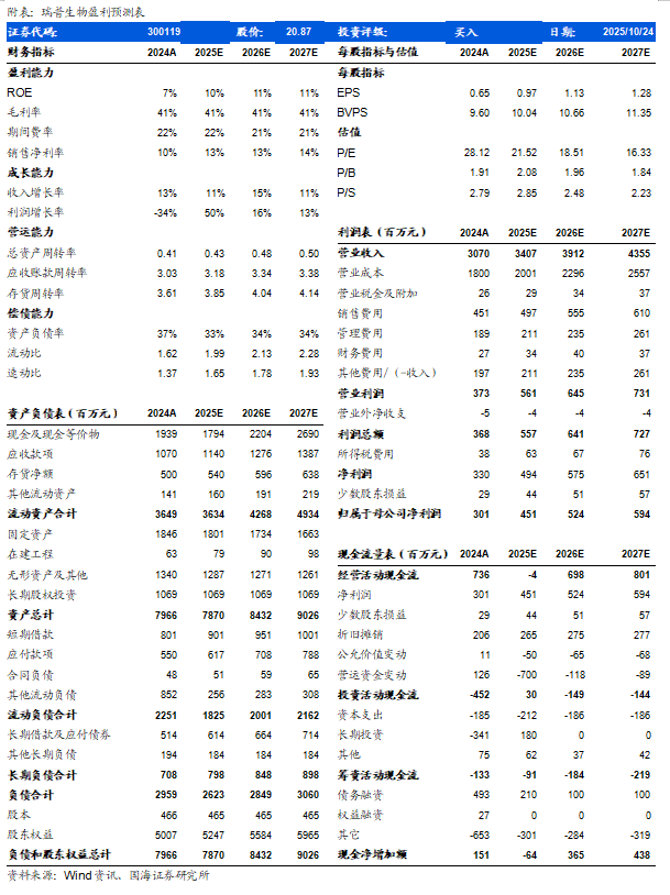 深化合作,开拓反刍疫苗市场。2025年9月,公司与圣维生物合资设立瑞圣生物,拟开展牛羊等反刍动物疫苗的研发生产。圣维生物为圣农发展控股股东圣农集团的控股子公司,我们认为此次合作一方面有利于公司增进与圣农发展合作关系,另一方面有利公司拓展产品品类。  布局合成生物赛道,打造中长期增长点。公司将2021年向特定对象发行股票的部分募集资金用途,变更为“生物制造产业化工程建设项目”。该项目为万吨级微生物蛋白产业化示范工程项目,总投资为6.79亿元,其中募集资金投资2.96亿元,由瑞普生物及全资子公司天津瑞狮生物科技有限公司负责实施,主要生产菌丝蛋白原料及相关产品。此次前瞻布局合成生物新赛道,将推动公司主营业务从动保领域向更广阔的优质蛋白解决方案延伸,实现业务的战略拓展与升级。盈利预测和投资评级:公司经营业绩持续向好,我们调整公司2025-2027年营业收入至34.07、39.12、43.55亿元,同比 10.99%、 14.81%、 11.32%。归母净利润4.51、5.24、5.94亿元,同比 49.88%、 16.26%、 13.34%。对应当前股价PE分别为21.5x、18.5x、16.3x。基于公司积极拓展新业务,维持“买入”评级。风险提示:畜禽价格大幅下降风险、重大动物疫病风险、新业务推进不及预期、行业竞争加剧、新产品研发及上市不及预期等。
