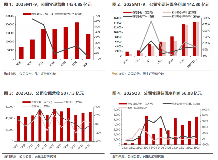 单季度看,2025Q3 公司实现营业收入507.13亿元,同比减少2.36%,环比增长3.99%,实现归母净利润56.08亿元,同比增长96.40%,环比增长18.69%, 扣非归母净利润58.13亿元,同比增长98.63%,环比增长21.21%。业绩超市场预期。