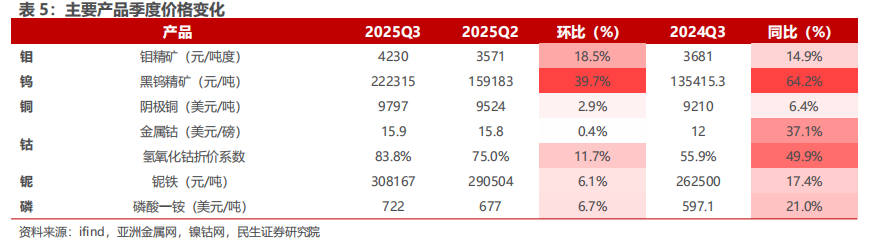 - 其他板块:2025Q3钨价、钼价、铌价、磷价分别同比变化 14.9%、 64.2%、 17.4%、 21.0%。国内钼钨板块中,黑钨精矿价格同比增长64.2%,环比增长39.7%,钨价有望继续维持在历史较高区间;巴西铌磷板块中,铌铁/磷酸一铵价格同比分别增长17.4%/21.0%,环比分别增长6.1%/6.7%。