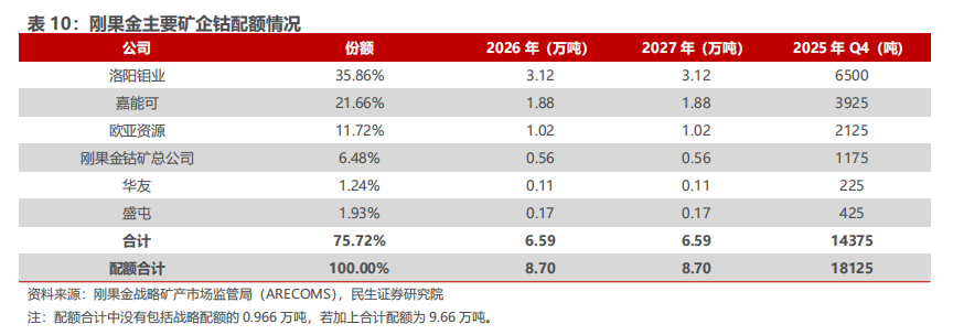 刚果金钴结束出口禁令,转而实施年度出口配额管理制度。公司2026年钴销量或有较大下滑,但得益于钴价抬升,整体盈利能力提升。9月底,刚果(金)战略矿产监管局(ARECOMS)宣布自10月16日起,刚果(金)将结束持续近8个月的出口禁令,转而实施年度出口配额管理制度。根据刚果(金)战略矿产市场监管局公布的新规:2025年剩余时间(10月16日-12月31日),出口上限为18125吨,按月分配为10月3625吨、11月7250吨、12月7250吨;2026-2027年,年度配额锁定96600吨,其中87000吨为“基础配额”,9600吨为“战略配额”(预留国家重点项目)。10月11日,刚果(金)战略矿产市场监管局宣布了钴出口配额明细,根据矿企截止2024年底的三年出口情况按比例计算。根据名单,洛阳钼业KFM和TFM分别获得4250和2250吨配额,占2025年Q4总出口配额18125吨的23.45%和12.41%,合计占比35.86%,由此推算2026-2027年公司出口配额合计为3.12万吨。由于产品销售有三个月左右的运输周期,因此Q4的配额尽管已经落地,但实际销售或将在25Q1兑现。