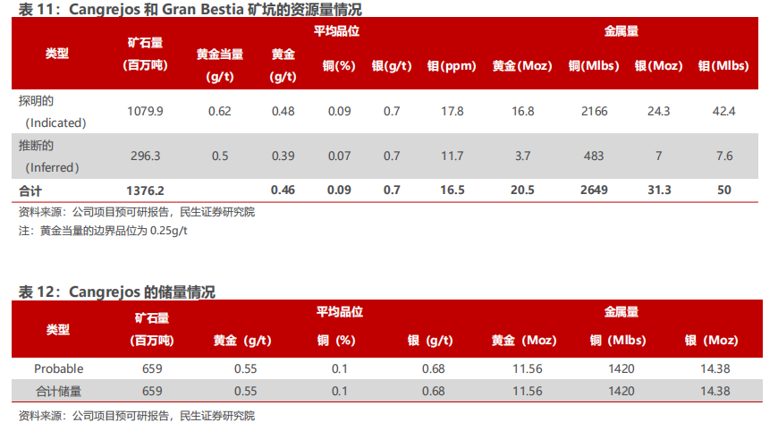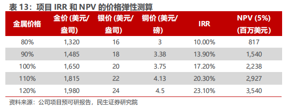 成本与收益:根据预可研报告,生命周期内矿山单位运营成本为818美元/盎司黄金当量,假设金价1650美元/盎司,银价20美元/盎司,铜价3.75美元/磅,项目IRR为17.2%,NPV为22.38亿美元(5%折现率)。考虑到当前金银铜价格均远超假设价格,实际项目IRR和NPV或较高。