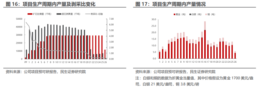 产量:低剥采比露天开采,达产后预计平均年产黄金11.5吨,铜1.9万吨。根据预可研报告,项目采用露天开采,全生命周期平均剥采比仅为1.7,预计成本可控。项目开采年限为26年,平均年产黄金11.5吨,白银7.2吨,铜1.9万吨,折合黄金当量合计14.5吨。峰值(投产后第16年)黄金产量达到21.7吨,铜产量达到4.2万吨。其中生命周期平均回收率假设为黄金85%,铜78.9%,白银54%。根据中报预期,项目正加速证照办理和建设准备工作,计划2029年前投产。
