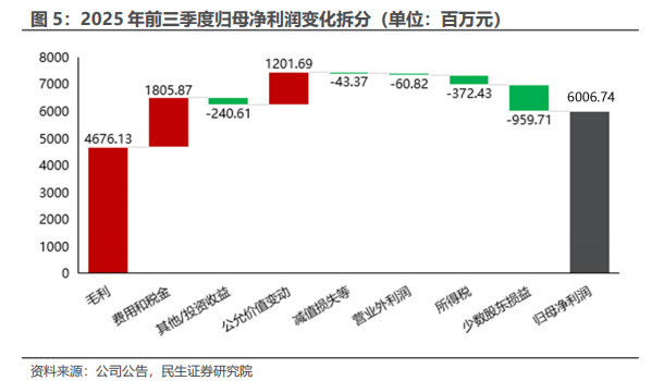 2025 年前三季度,公司实现营业收入1454.85亿元,同比减少 5.99%,实现归母净利润142.80 亿元,同比增长72.61%。业绩同比增长主要得益于毛利增长、费用节约及公允价值变动。毛利增长主要得益于主要金属价格上涨以及产销 量提升,其中铜钴板块毛利增长贡献主要增量。前三季度财务费用10.3亿元,同比减少60%,大幅下降,主要因借款规模同比下降以及汇兑收益增加;公允价值变动同比增利12.02亿元,主要是本期基本金属贸易业务衍生工具公允价值变动收益同比上升。主要减利项则为所得税和少数股东权益。
