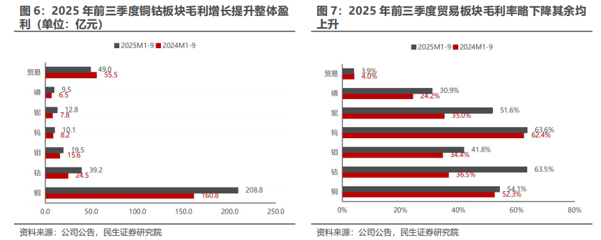 环比来看,2025Q3 v.s. 2025Q2:2025Q3,公司归母净利润环比增加8.83亿元。增利主要来自于毛利( 21.39亿元),其中铜/钴/钼/钨/铌/磷/贸易/内部抵消的毛利分别环比变化 1.5/-8.4/ 1.8/-0.9/ 0.2/-1.4/ 13.6/ 14.4亿元。主要的利润增长来自于贸易和内部抵消项,考虑到Q3公允价值变动环比减利20.3亿元或主要为贸易端的期货损失,期现结合下盈利与亏损相互抵消。费用及税金( 4.26亿元),原因或为利息费用降低(环比-0.86亿元)和汇兑收益增加,所得税( 6.68亿元),Q3实际税率下降至27.5%,环比减少9.5pct,主要或因为Q2刚果金汇算清缴,所得税费用高基数。