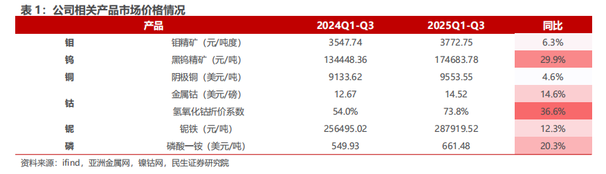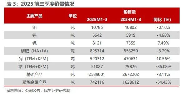 2025 年前三季度,公司主要产品销量表现分化,铌和铜销量同比增长,其他产品销量同比减少,钴销售主要是受到刚果金政府禁止钴出口禁令的影响。值得注意的是,尽管刚果金出口禁令2月份就已经执行,但是公司有部分在途库存可以销售,因此前三季度钴均有销售,但销量逐季下降。
