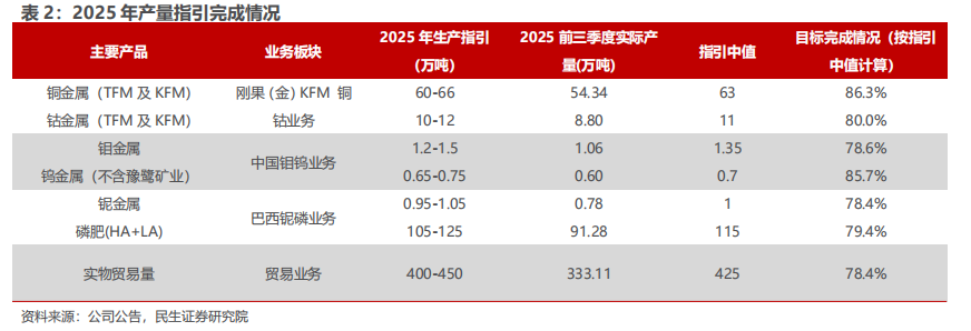 - 贸易板块:贸易金属量略超指引中值。2025 年前三季度实物贸易量达 333.11 万吨,完成全年计划(指引中值)的 78.4%。