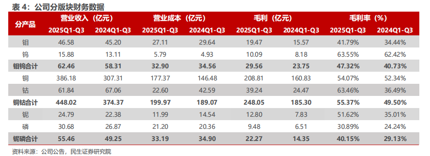 - 钼钨板块:价格上涨,但销量下降,盈利同比增长。2025年前三季度,公司钼、钨产品价格同比上涨,毛利率同比增长6.6pct 至47.32%,但产销量同比下滑影响了毛利增长幅度。产销量下滑主要是因为品位下降,以及价格抬升后影响销售节奏。