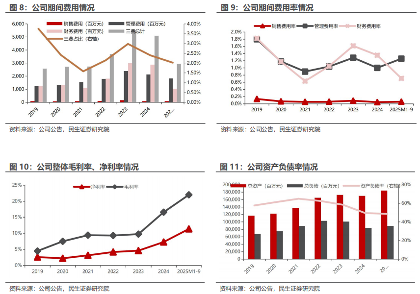 2025 年前三季度公司期间三费为29.37 亿元,同比减少14.40 亿元,主要是财务费用大幅下降。其中,销售费用0.81 亿元,同比增加0.09 亿元;管理费用18.26 亿元,同比增加0.85 亿元。财务费用10.30 亿元,同比减少15.34 亿元, 主因借款规模同比下降,本期利息支出较上年同期减少,此外汇兑收益增加也是财务费用减少的原因。2025年三季度末资产负债率较2024年底下降0.95ct至48.57%。