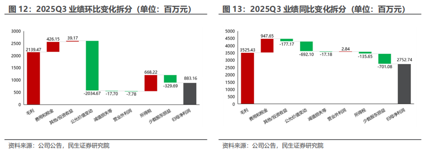 同比来看,2025Q3 v.s. 2024Q3:2025Q3,公司归母净利润同比增加27.53亿元。增利主要来自于毛利( 35.25亿元),得益于主要金属量价齐升,费用及税金( 9.45亿元),得益于财务费用下降。