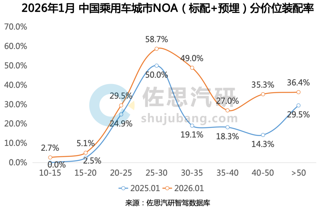 分价位看,2026年1月,30-50万元乘用车城市NOA(标配 预埋)装配量5.1万辆,同比暴涨210.0%;装配率从去年同期19.1%跃升至49.0%,主要受问界、小米、魏牌等品牌拉动。