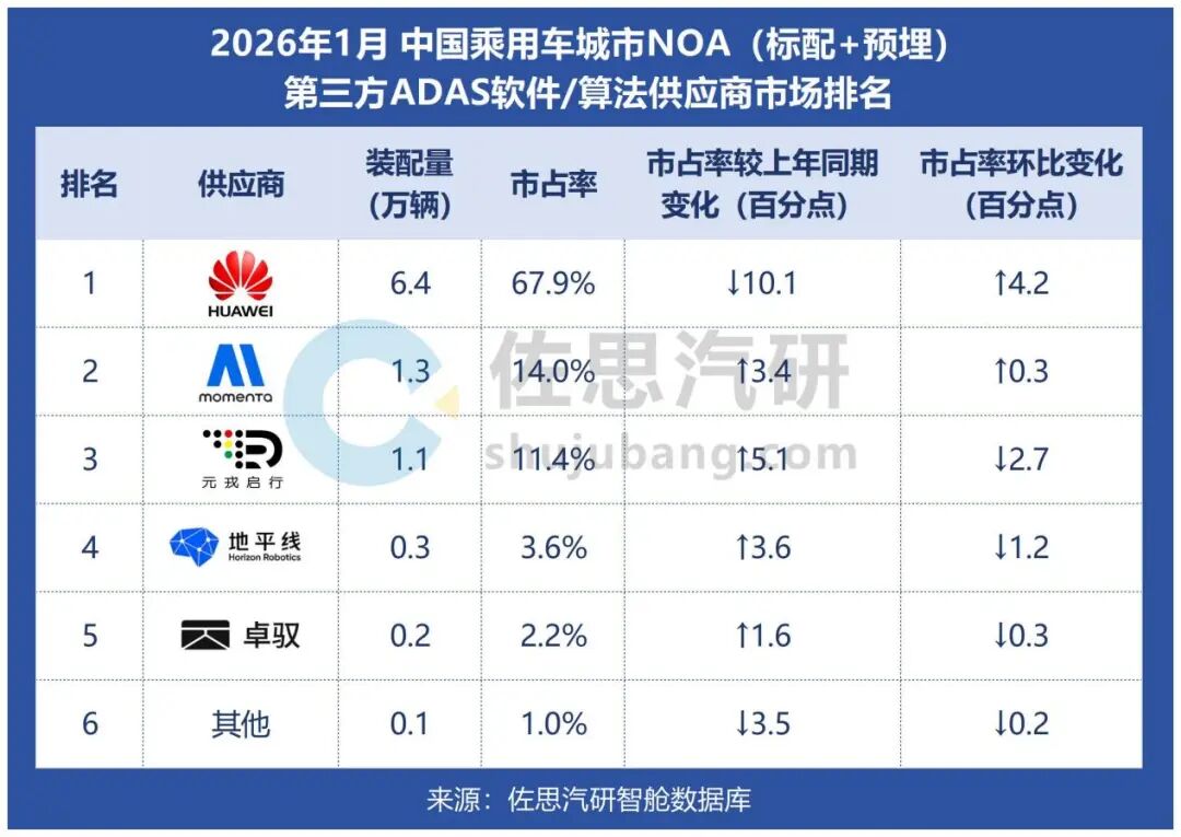 2026年1月,华为(含五界)、元戎启行、Momenta合计市占率从2025年1月的96.7%升至99.5%,市场几乎被三者垄断。
